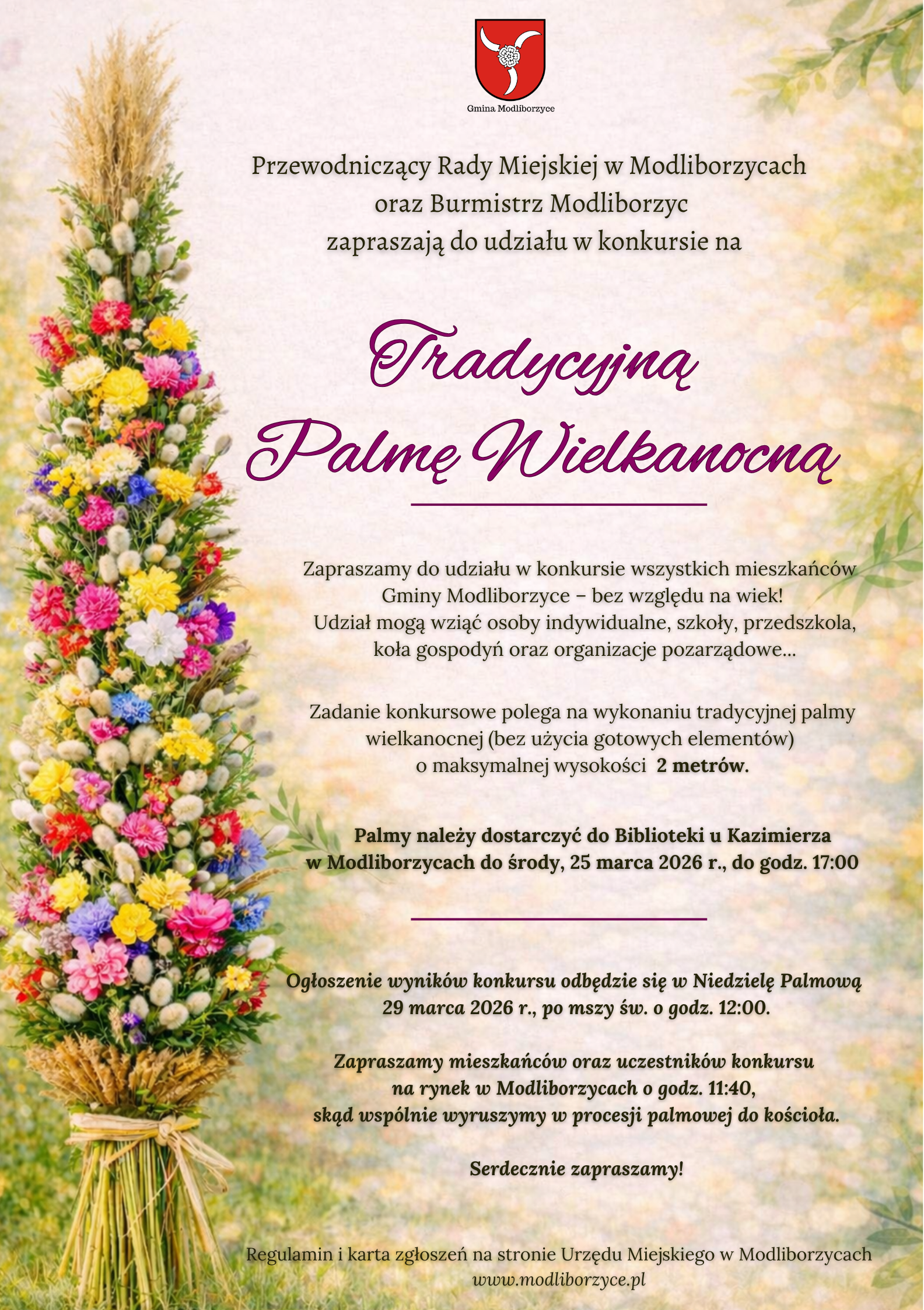 Przewodniczący Rady Miejskiej w Modliborzycach oraz Burmistrz Modliborzyc zapraszają do udziału w konkursie na "Tradycyjną palmę wielkanocną".