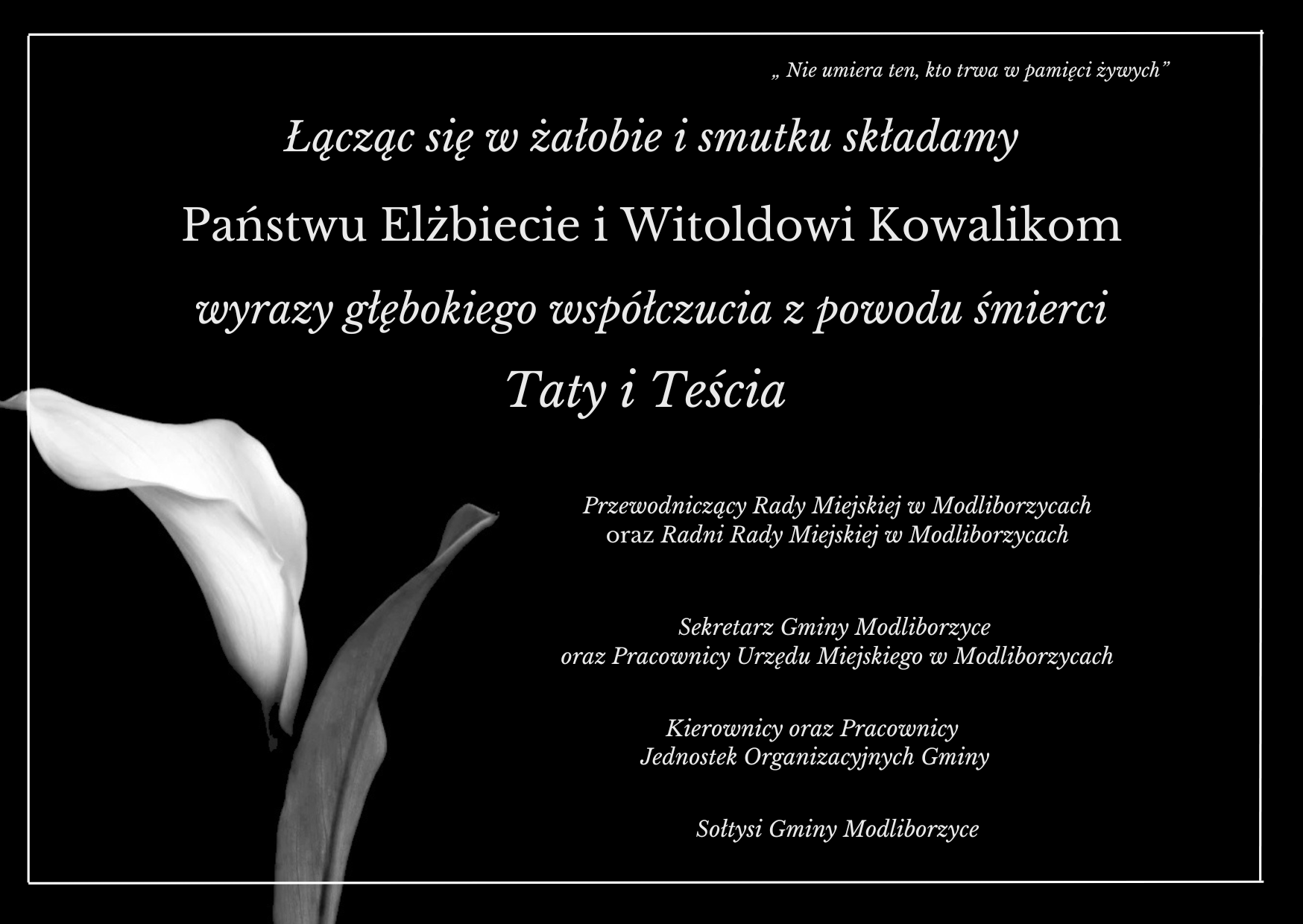 Łącząc się w żałobie i smutku składamy Państwu Elżbiecie i Witoldowi Kowalikom wyrazy głębokiego współczucia z powodu śmierci Taty i Teścia.